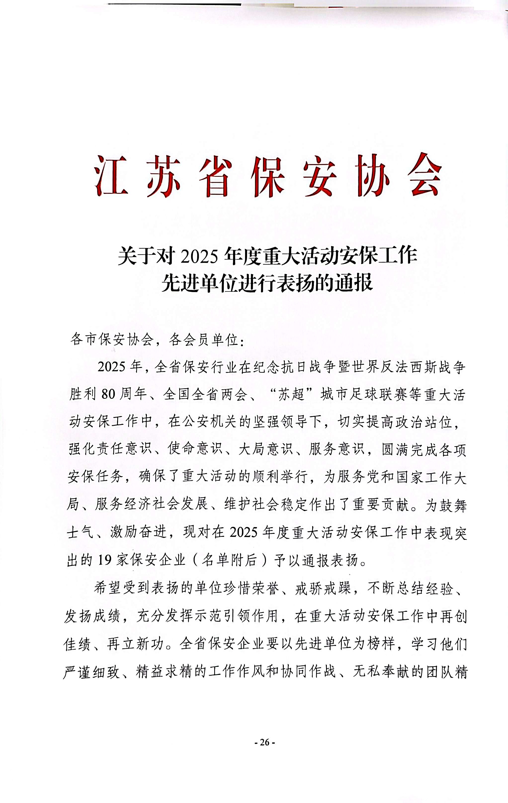 1月28日,從江蘇省保安協(xié)會傳來喜訊,南京市保安服務(wù)有限公司(以下簡稱“南京市保”)被授予“2025年度重大活動安保工作先進(jìn)單位”榮譽(yù)稱號。這一表彰是行業(yè)主管部門對公司專業(yè)能力與責(zé)任擔(dān)當(dāng)?shù)某浞终J(rèn)可,更是全體南京保安凝心聚力、實干履職的成果體現(xiàn)。